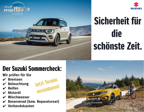 Ob große Fahrt oder kleiner Ausflug – im Sommer macht es besonders viel Spaß, mit Ihrem Suzuki unterwegs zu sein. Damit die schönsten Fahrten des Jahres kein Wölkchen trüben kann, sind wir jetzt mit unserem Sommercheck für Sie da. Wir prüfen die wichtigsten Sicherheits- und Funktionsmerkmale Ihres Suzukis auf Herz und Nieren, damit Sie in den kommenden Monaten sicher unterwegs sind. Natürlich auch für andere Modelle und Fabrikate.