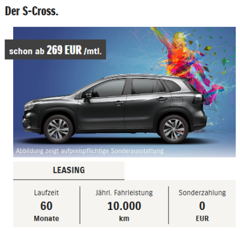 Leasingbeispiel für einen S-Cross 1.4 BOOSTERJET HYBRID Comfort (95 kW | 129 PS | 6-Gang-Schaltgetriebe | Hubraum 1.373 ccm | Kraftstoffart Benzin): Verbrauchswerte: kombinierter Energieverbrauch 5,3 l/100km; kombinierter Wert der CO₂-Emission: 120 g/km; CO₂-Klasse: D. Auf Basis des Fahrzeugpreises in Höhe von 30.790 Euro, zzgl. 1.490 Euro Bereitstellungskosten und 190 Euro Auslieferungspaket; Gesamtpreis: 16.140 Euro; Leasing-Sonderzahlung: 0 Euro; Laufzeit: 60 Monate; jährliche Fahrleistung: 10.000 km; 60 monatliche Leasingraten à 269 Euro; Bonität vorausgesetzt. Vermittlung erfolgt allein für die Creditplus Bank AG, Augustenstraße 7, 70178 Stuttgart. Nur beim teilnehmenden Suzuki Partner. Abbildung zeigt aufpreispflichtige Sonderausstattung. Aktionszeitraum: 01.04.2024 - 30.06.2024. Nicht mit anderen Suzuki Aktionen kombinierbar. Es besteht ein gesetzliches Widerrufsrecht für Verbraucher.