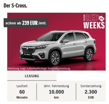 Leasingbeispiel für einen S-Cross 1.4 BOOSTERJET HYBRID Comfort (95 kW | 129 PS | 6-Gang-Schaltgetriebe | Hubraum 1.373 ccm | Kraftstoffart Benzin) Verbrauchswerte: kombinierter Energieverbrauch 5,4l/100 km; kombinierter Wert der CO₂-Emission: 121 g/km; CO₂-Klasse: D. Auf Basis des Fahrzeugpreises: 31.440 Euro; Laufzeit: 60 Monate; jährliche Fahrleistung: 10.000 km; Leasingsonderzahlung: 2.300 Euro; 60 monatliche Leasingraten à 239 Euro; zzgl. einmalig 1.390 Euro Bereitstellungskosten und einmalig 199 Euro Auslieferungspaket; Gesamtkosten über 60 Monate Vertragslaufzeit: 18.229 Euro. Bonität vorausgesetzt. Vermittlung erfolgt allein für die Creditplus Bank AG, Augustenstraße 7, 70178 Stuttgart. Nicht mit anderen Aktionen kombinierbar. Es besteht ein gesetzliches Widerrufsrecht für Verbraucher. Abbildung zeigt aufpreispflichtige Sonderausstattung. Aktionszeitraum: 01.10.2024 - 31.12.2024.