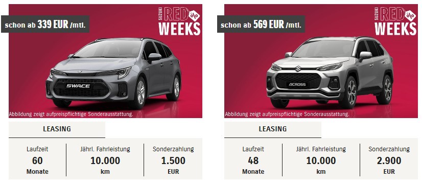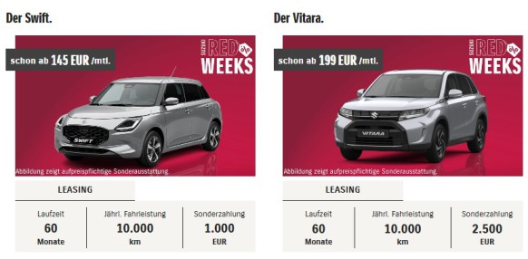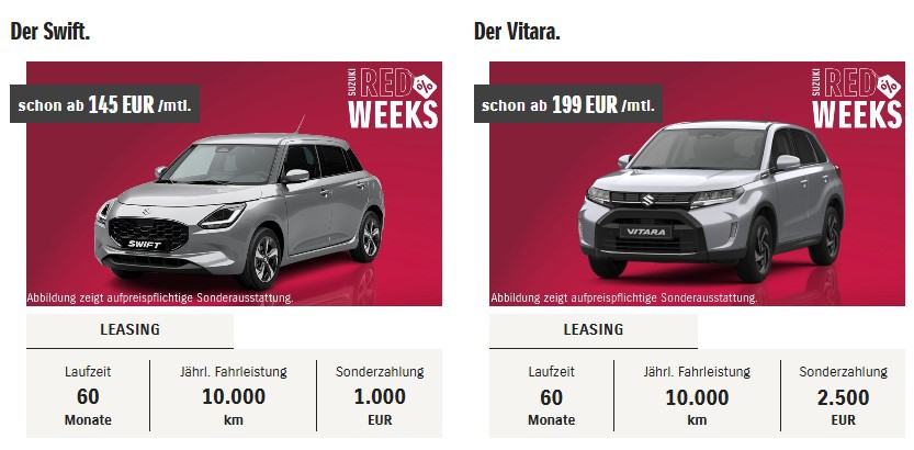 Leasingbeispiel für einen Vitara 1.4 BOOSTERJET HYBRID Club (95 kW | 129 PS | 6-Gang-Schaltgetriebe | Hubraum 1.373 ccm | Kraftstoffart Benzin) Verbrauchswerte: kombinierter Energieverbrauch 5,3l/100 km; kombinierter Wert der CO₂-Emission: 119 g/km; CO₂-Klasse: D. Auf Basis des Fahrzeugpreises: 27.100 Euro; Laufzeit: 60 Monate; jährliche Fahrleistung: 10.000 km; Leasingsonderzahlung: 2.500 Euro; 60 monatliche Leasingraten à 199 Euro; zzgl. einmalig 1.390 Euro Bereitstellungskosten und einmalig 199 Euro Auslieferungspaket; Gesamtkosten über 60 Monate Vertragslaufzeit: 16.029 Euro. Bonität vorausgesetzt. Vermittlung erfolgt allein für die Creditplus Bank AG, Augustenstraße 7, 70178 Stuttgart. Nicht mit anderen Aktionen kombinierbar. Es besteht ein gesetzliches Widerrufsrecht für Verbraucher. Abbildung zeigt aufpreispflichtige Sonderausstattung. Aktionszeitraum: 01.10.2024 - 31.12.2024.