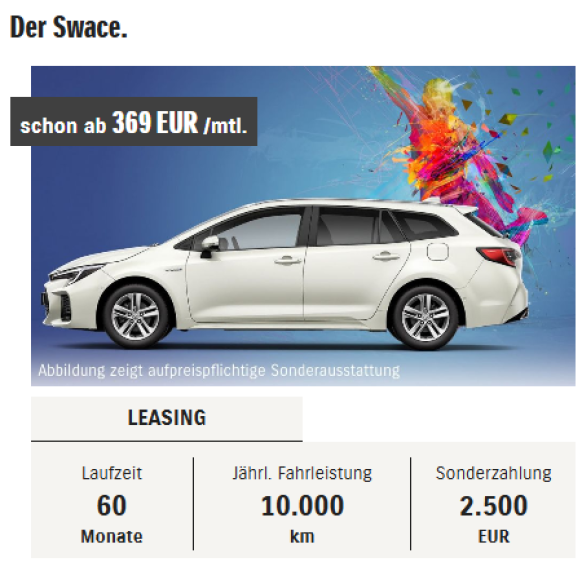 Leasingbeispiel für einen Swace 1.8 HYBRID CVT Comfort+ (Systemleistung 103 kW / 140 PS: Benzinmotor 72 kW / 98 PS und Elektromotor 70 kW | CVT-Automatikgetriebe (stufenlos) | Hubraum 1.798 ccm | Kraftstoffart Benzin): Verbrauchswerte: kombinierter Energieverbrauch 4,5 l/100km; kombinierter Wert der CO₂-Emission: 102 g/km; CO₂-Klasse: C. Auf Basis des Fahrzeugpreises in Höhe von 37.190 Euro, zzgl. 1.690 Euro Bereitstellungskosten und 190 Euro Auslieferungspaket; Gesamtpreis: 22.140 Euro; Leasing-Sonderzahlung: 2.500 Euro; Laufzeit: 60 Monate; jährliche Fahrleistung: 10.000 km; 60 monatliche Leasingraten à 369 Euro; Bonität vorausgesetzt. Vermittlung erfolgt allein für die Creditplus Bank AG, Augustenstraße 7, 70178 Stuttgart. Nur beim teilnehmenden Suzuki Partner. Abbildung zeigt aufpreispflichtige Sonderausstattung. Aktionszeitraum: 01.04.2024 - 30.06.2024. Nicht mit anderen Suzuki Aktionen kombinierbar. Es besteht ein gesetzliches Widerrufsrecht für Verbraucher.